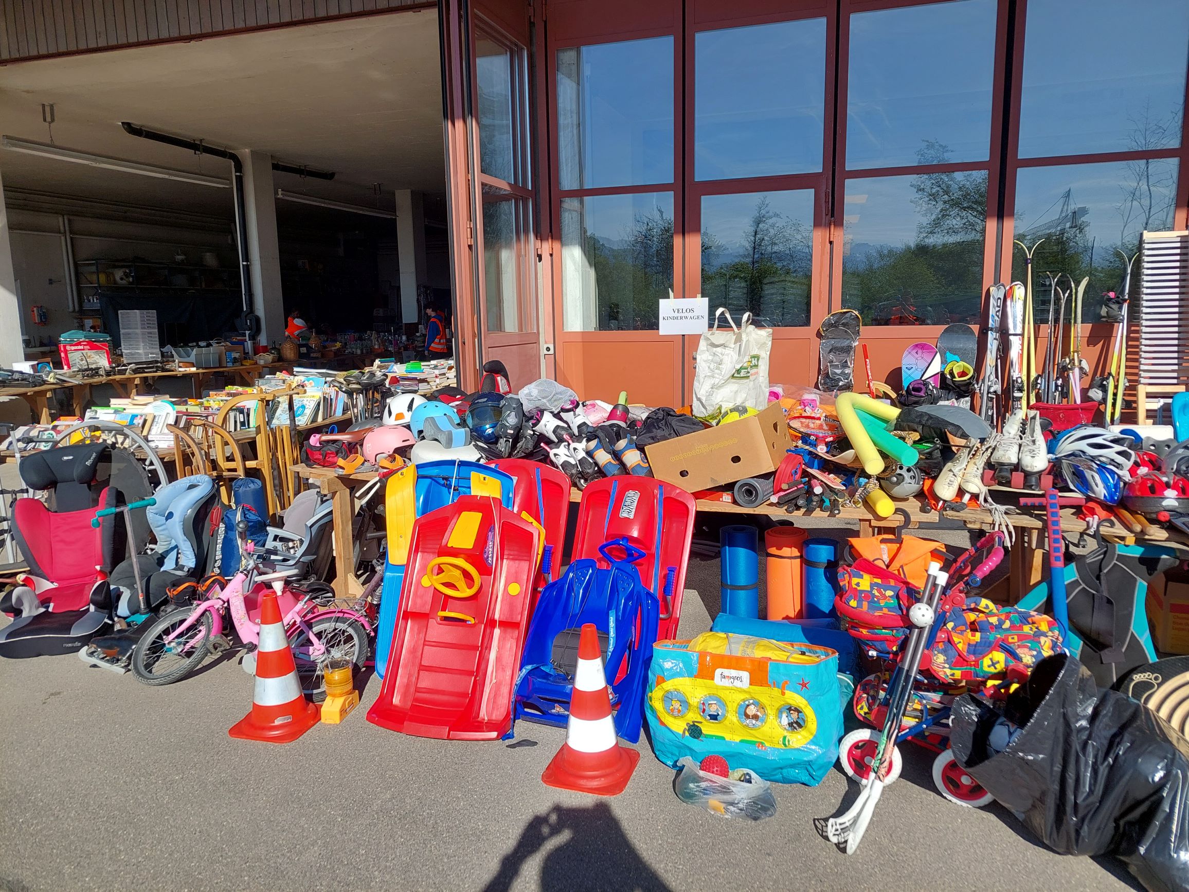 «Kaum öffnen wir die Tore, stürmen die Leute hinein», beschreibt Heidi Wirz das sich jährlich wiederholende Ritual. Von den unzähligen Sportausrüstungen, Kinderspielsachen, Büchern, Elektronikgeräten, Gartenwerkzeugen, Taschen, CDs, Autositzen, Wohnaccessoires und vielem mehr bleibe am Ende kaum etwas übrig. Den kleinen Rest entsorgt das Team auf Kosten der Gemeinde, und zwar säuberlich getrennt nach Metall, Grubengut, Elektroschrott etc. Um den Aufwand dafür in Grenzen zu halten, handelt es sich bei den grössten Gegenständen, die abgebeben werden dürfen, um Klein- und Kindermöbel. Nicht angenommen werden ausserdem Hygieneartikel, Kleider und Matratzen.